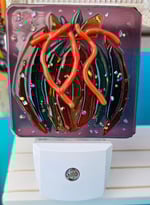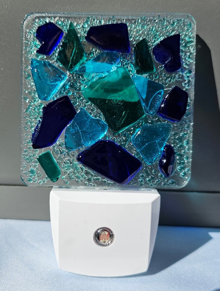 Bring a touch of artful glow to any room with these one-of-a-kind fused glass nightlights. Each piece is handcrafted with layers of vibrant glass, fused in a kiln to create stunning depth, texture, and sparkle. No two are ever alike — every nightlight showcases its own unique pattern and color blend.