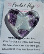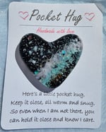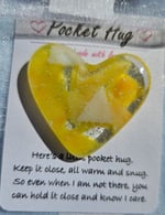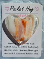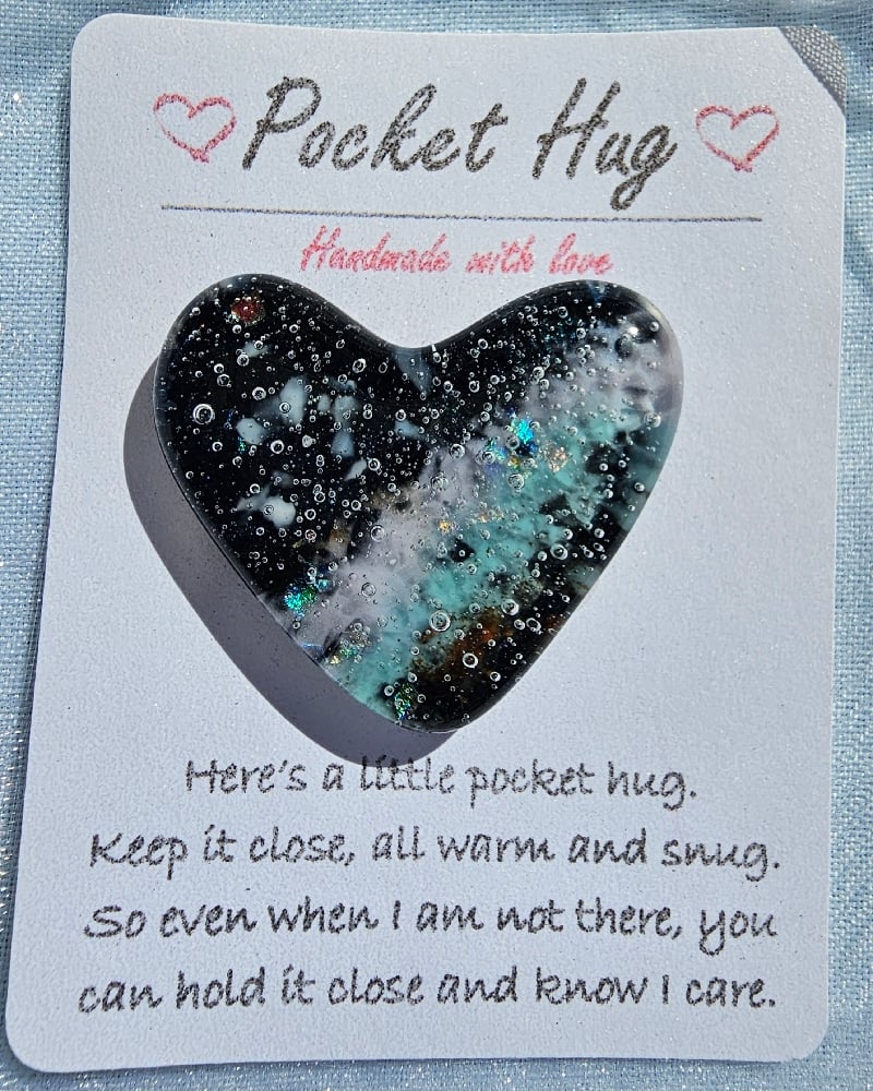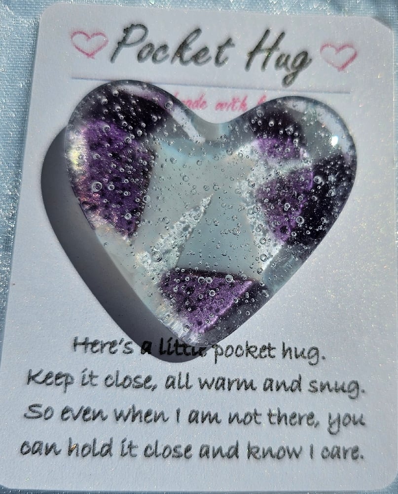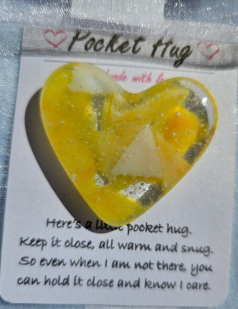 Send a heartfelt reminder of your love and care with this beautiful Pocket Hug. Each 2" handcrafted fused glass heart is unique, made with love and care to bring warmth and comfort. Nestled in a delicate white drawstring organza bag, the heart is mounted on a charming card featuring the thoughtful message:
